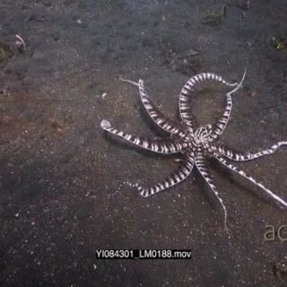 Close up tracking shot of a mimic octopus, octopus sp19, Thaumoctopus mimicus swims in the sea above the sand