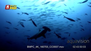 Select options DownloadSilhouetted scalloped hammerhead shark glides through school of fusilliers during daytime. LA.