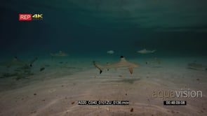 Wide shot of juvenile and adult blacktip reef shark hunting for food. Note reflections on the underwater sea surface