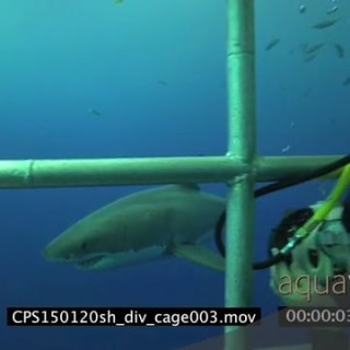 Divers filming a Great White Shark swimming underwater in ocean from cages MLS PAN HAND