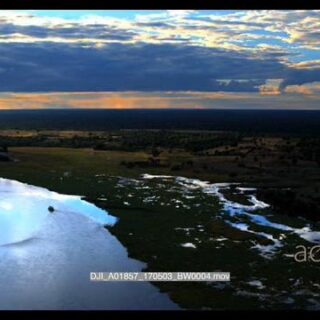 Stunning Aerial tilt from the okavango river to the orange sunset showing the flooded areas close to the river