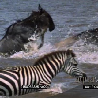A herd of wildebeest crossing the river and a crocodile hunting and fails to catch