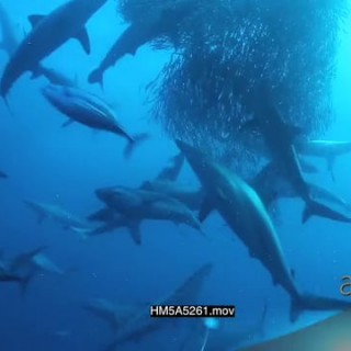 Blacktip Sharks and Skipjack tuna attacking and feeding on Sardine bait ball and diver taking pictures WS PAN HAND