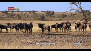 wide shot of a herd of wildebeest, connochaetes standing nervously at a waterhole note the two juveniles
