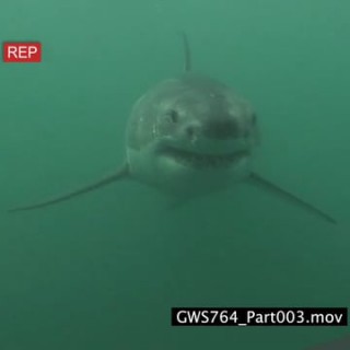 Great White Shark swimming towards camera underwater in ocean then passing by MLS CU HAND