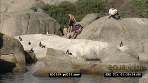 African Penguins at Boulders Beach, with beachgoers and bathers
