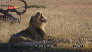 Male lion with its black mane licking its mane looking directly into camera yawning and exposing its huge sharp teeth and licking its lips