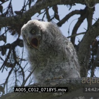 Young Great Gray Owl regurgitating a pellet