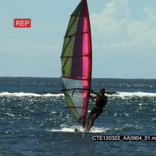 People walking across frame on beach as Windsurfer surfs towards camera