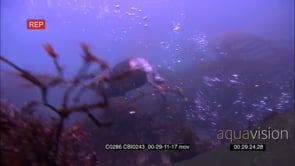 Adult Sea Otter digging on the sea floor trying to locate preys using its forelegs paws and swimming off frame. UW;DAY;