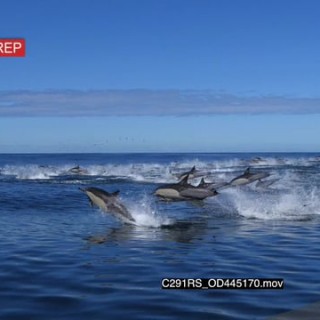 A school of common dolphins porpoising and swimming TOPSIDE LWS PROFILE GOOD LIGHT