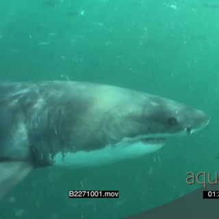 A Great white sharks gently swimming underwater in ocean passing by camera and through school of Fransmadams UW HAND