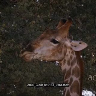 close up shot of the head of a giraffe chewing the leaves of a thorn tree