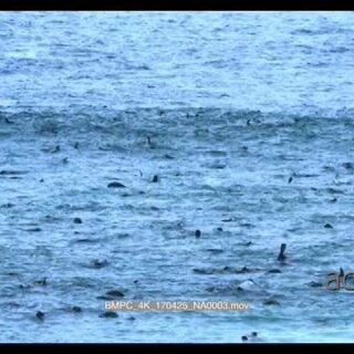 TOPSIDE a group of seals and a school of common dolphins swimming, porpoising and feeding on a bait ball of sardines