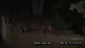Hippo mother and young newborn baby calf walking at NIGHT