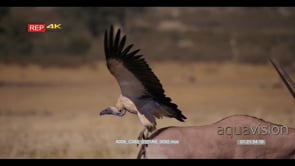 close up shot of slow motion tracking shot of a large white-backed vulture Gyps africanus who flies away when a Gemsbok gets too close note its large opens wings
