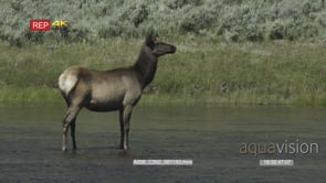 3 spotted elk calves grooming and 1 female adult, adult runs