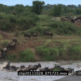 Blue Wildebeest herd running from bushveld crossing river migrating WS HAND AmCam