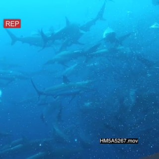 Blacktip Sharks and Cape Gannets feeding UW on Sardine bait ball WS PAN HAND