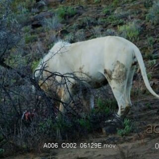 Male White Lion side view, standing, looking around and feeding on a hunted carcass.