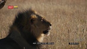 Close up super slow motion side view shot of the face of a male lion with its black mane sneezing