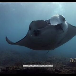 Female manta ray swimming towards camera and float right above the camera touched camera by accident and dashed off