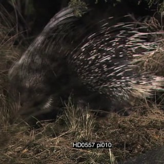 Juvenile Cape Porcupine foraging cautiously walking into burrow at NIGHT