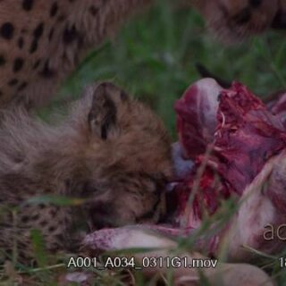 Female Cheetah and her Cub laying down, biting and feeding on the dead carcass remaining.