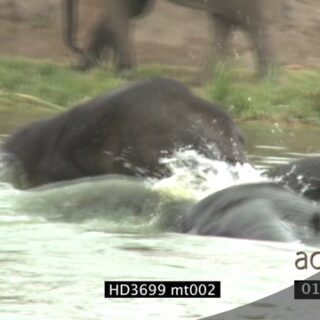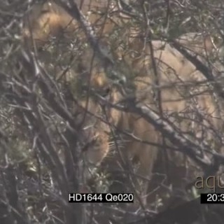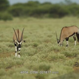Pair of Gemsbok standing, slowly walking while feeding on grass.