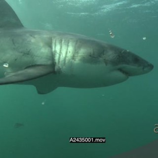 Great White Shark gently swimming underwater in ocean PAN HAND
