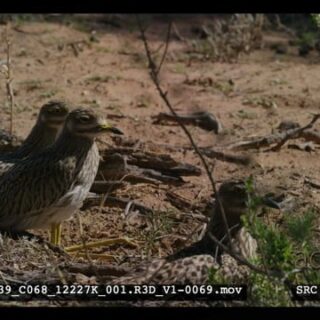 Close up shot of a parent spotted thick knee bird standing with two juvenile chicks