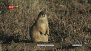 Jackal walking past flock of vultures with the wind an dusty blowing