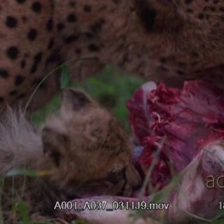 Female Cheetah and her Cub feeding on the dead carcass while laying down.