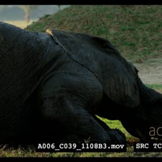 African Elephant laying down, taking a mud bath and digging with its tusks.