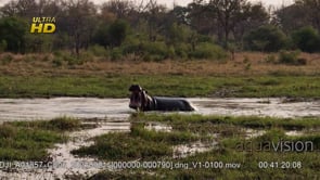 Adult Hippo yawning, looking around and calf following her and submerged. MWS.