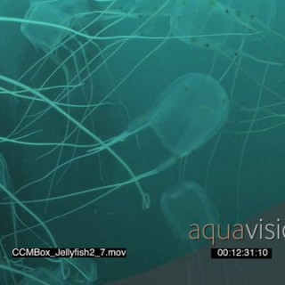 School of Box Jellyfish swimming and floating underwater in ocean MLS PAN TRA
