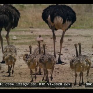 Close up shot of four adult ostrich and their chicks walking through butteries that have hatched after the rain