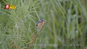 Malachite Kingfisher perched on grass twigs, looking around and flying off frame. MLS.