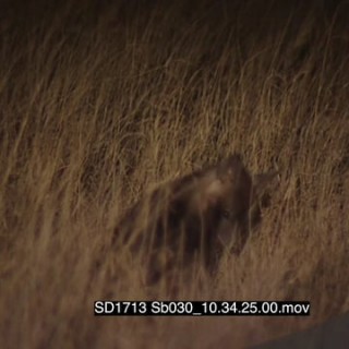 Brown hyena foraging in tall dry grass at NIGHT