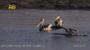 Select options DownloadThree Pink-backed pelican floating above the water surface, searching for aquatic food and passing by a submerged adult Hippo,AW;DAY