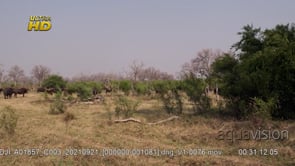 Young and adult herd of Cape buffalo general behaviour display, looking around, grazing on grass and laying down. WS;PAN.