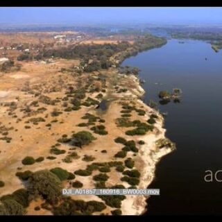 High aerial shot along chobe river during dry season with kasane in the distance from the elephant corridor towards kasane