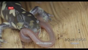 Tiger Salamander laying on wood biting on and trying to swallow a moving worm HA MCU HAND