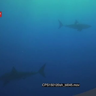 Great White Sharks (2) gently swimming in deep blue ocean with sun shinning through AmCam UW
