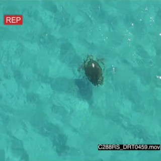 A Tracking shot of a Green Sea Tutle, Chelonia mydas eating sea grass with two Remoras attatched when it swims away into blue ocean.