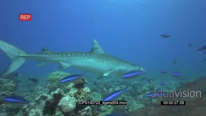 Great White Sharks (3) underwater in deep ocean passing by camera PAN HAND GREEN