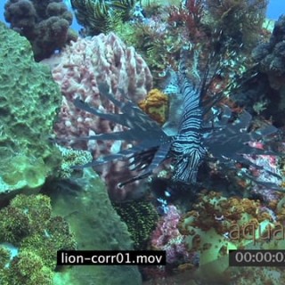 A Close Up of Lionfish, Pterois sp hunting for food over open feeding soft coral on a coral reef.