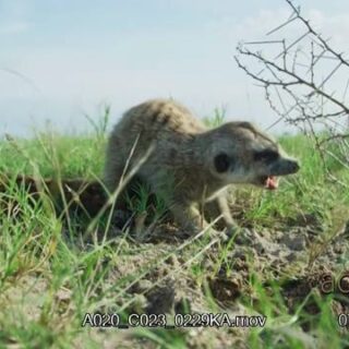 Two Meerkat digging burrows, feeding on invertebrates and walking away.
