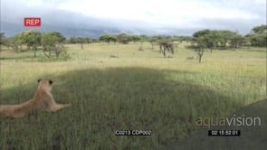 African Lioness laying resting in shade, looking at Wildebeest herd in distance MS