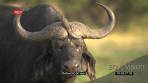 Cape buffalo bull feeding on grass with oxpecker sitting on its horns